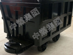 曲轨侧卸式矿车是由车轮组、车架、销轴、车厢、卸载曲轨、翻卸轮、销轴、门钩、车厢门、支撑铁拉杆等部件组成。